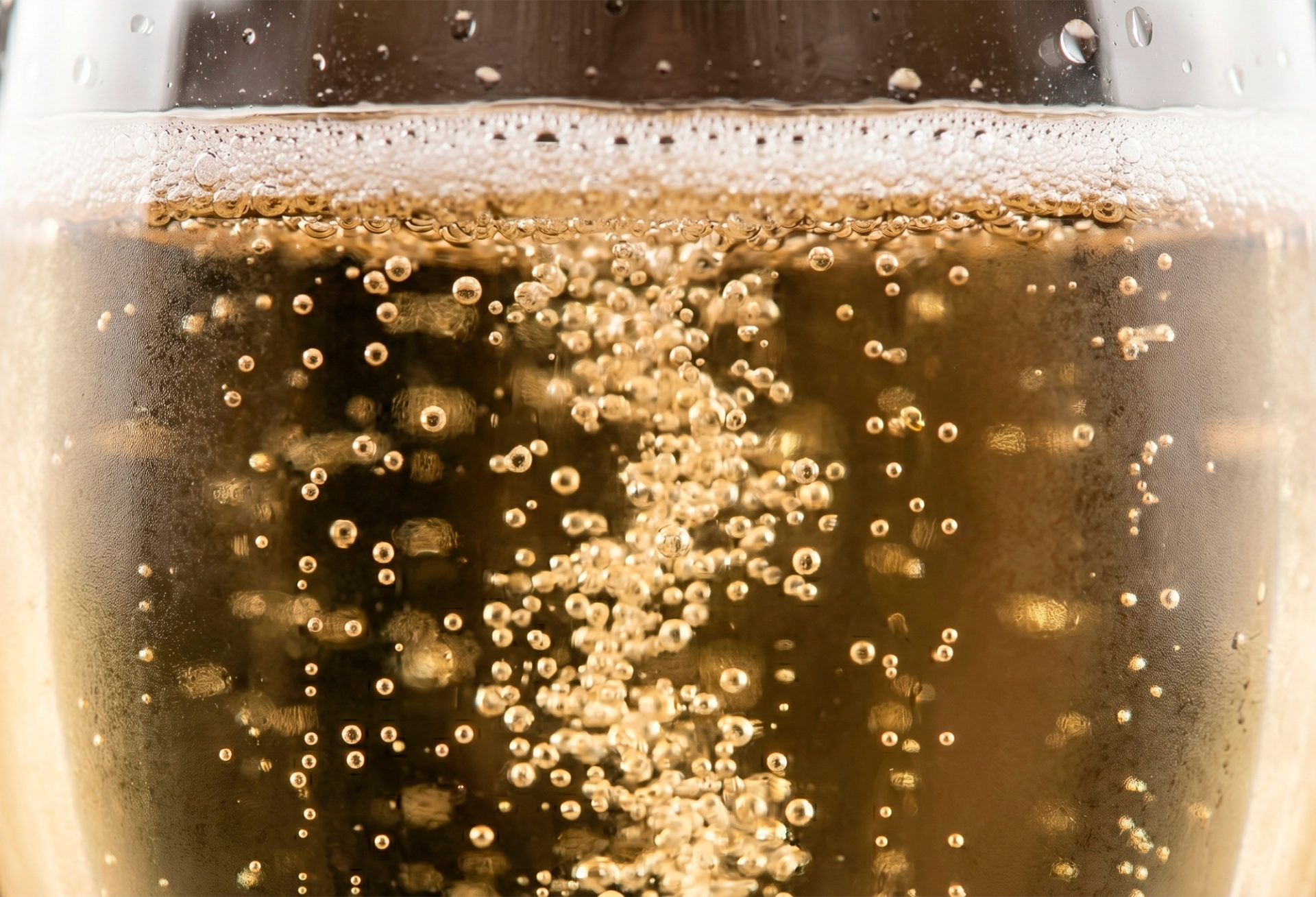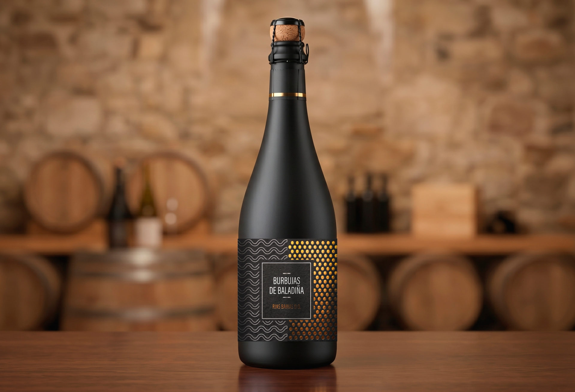 La etiqueta se divide en dos lenguajes visuales. Las ondas en relieve representan el origen y la geometría en oro expresa la burbuja. Un sistema dual de diseño de etiqueta de vino espumoso aplicado a toda la botella para generar coherencia y reconocimiento.